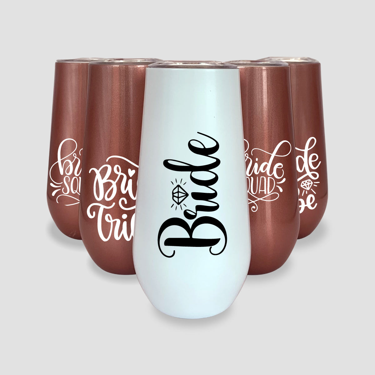 This 5 pack of elegant Bridal Champagne Tumblers are the perfect gift for your bride and bridesmaids. Each tumbler comes with a lid and features a beautiful golden rose finish for a distinguished look. Be sure to delight your squad with this special gift!