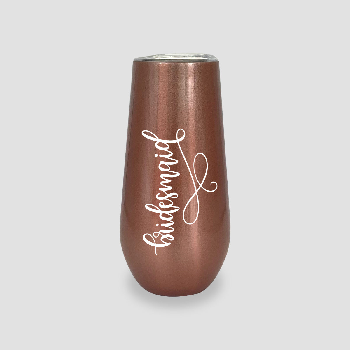 This 6 ounce Champagne Tumbler, made from a shatterproof and hardy material, offers a stylish way to drink your preferred sparkling drinks. This tumbler comes customized with the label "Bridesmaid" and can maintain the ideal temperature, making it an excellent choice for bridal showers and weddings.