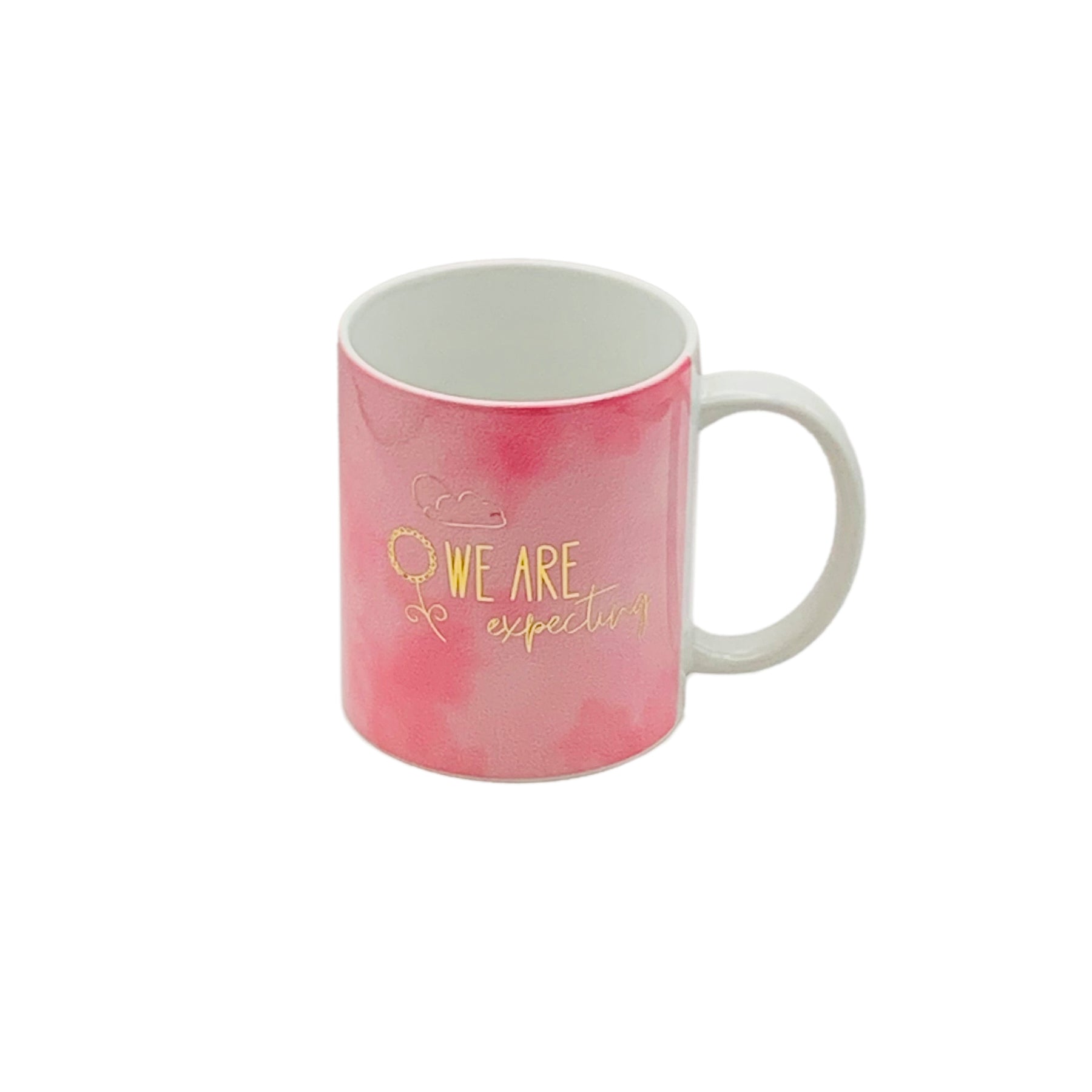This 12oz Pink Mug is made of ceramic and includes a flower design along with the phrase "We are expecting". It is a great gift option for a baby shower.