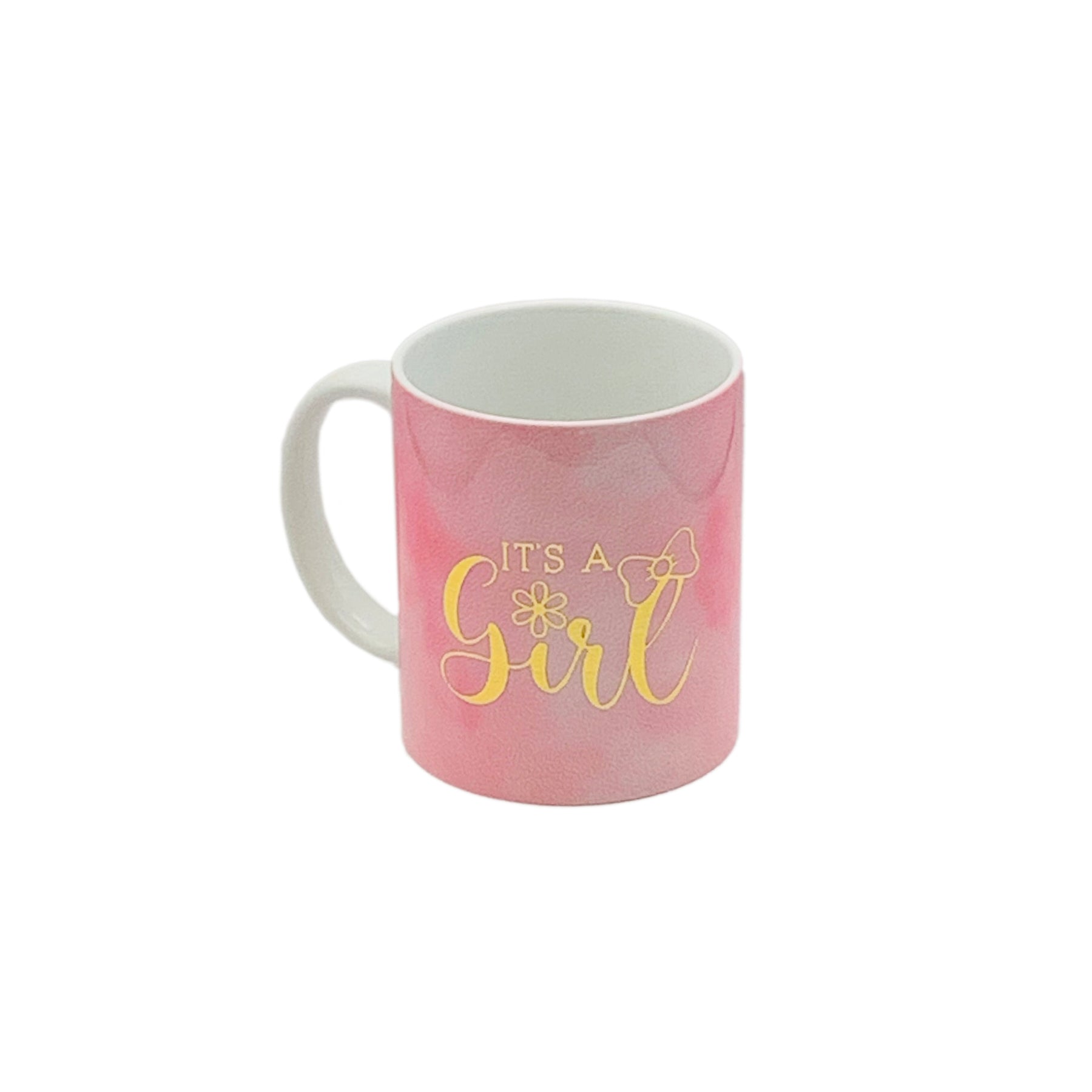 This 12oz Pink Mug is made of ceramic with the phrase "It's a Girl". It is a great gift option for a baby shower.