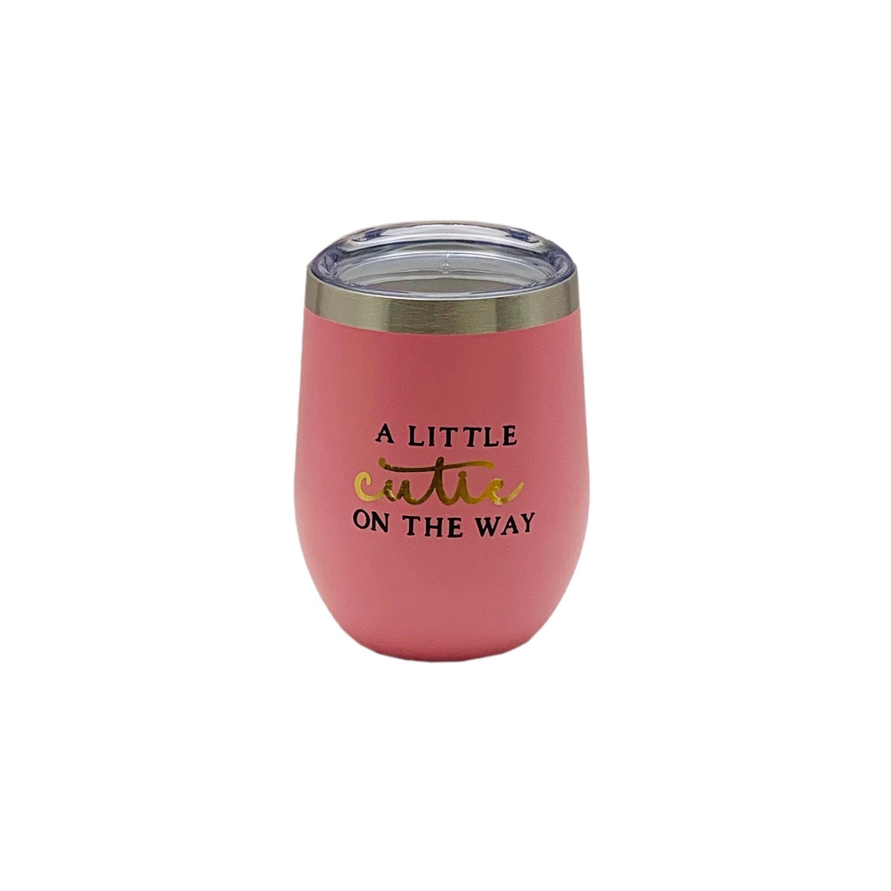 This Pink insulated stemless wine tumbler features the phrase "Little Cutie on the Way," making it a fantastic option for any baby shower.
