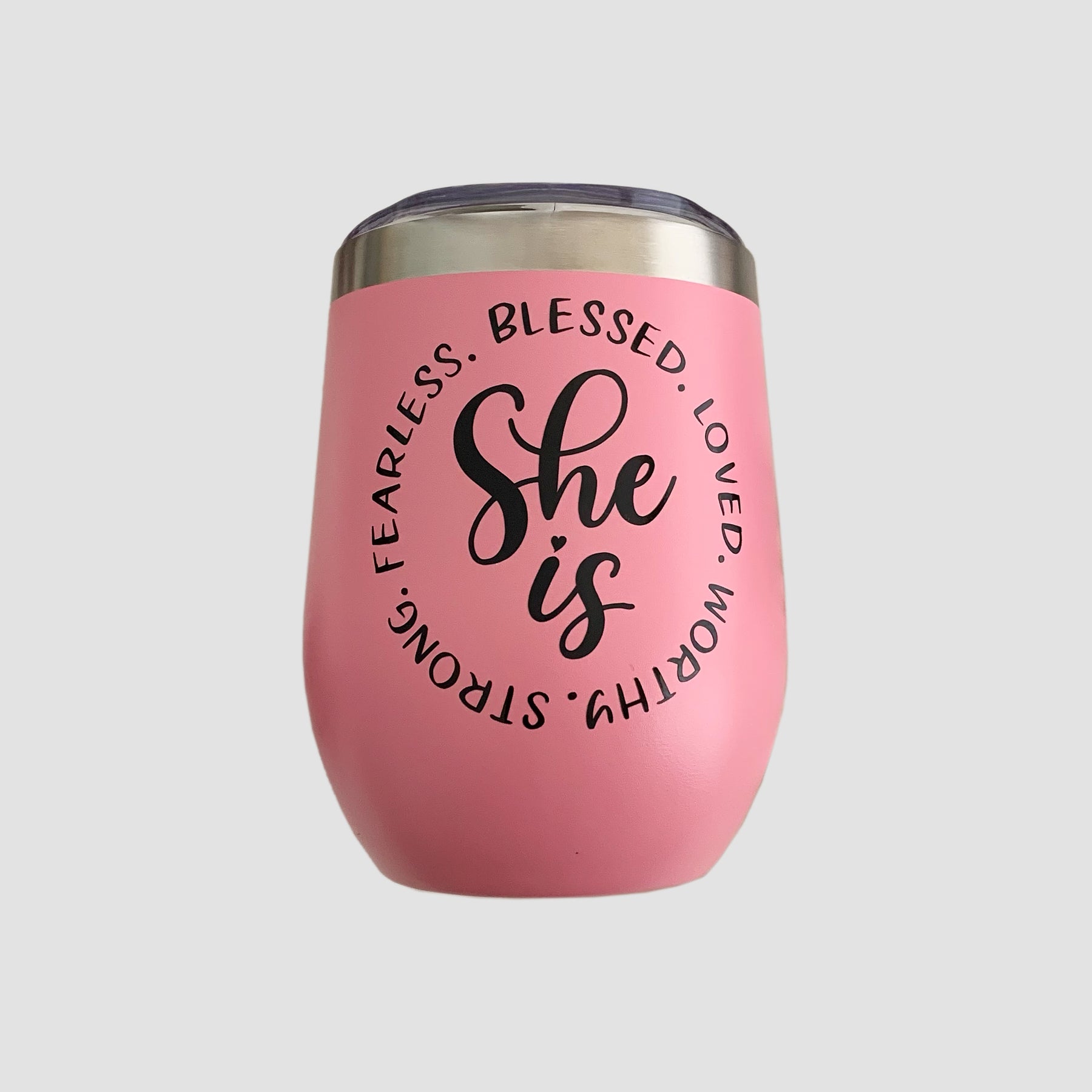 This insulated stemless wine tumbler is pink and showcases the phrase "She is...Blessed, Loved, Worthy, Strong, Fearless", making it an ideal choice for celebrating Mother's Day.