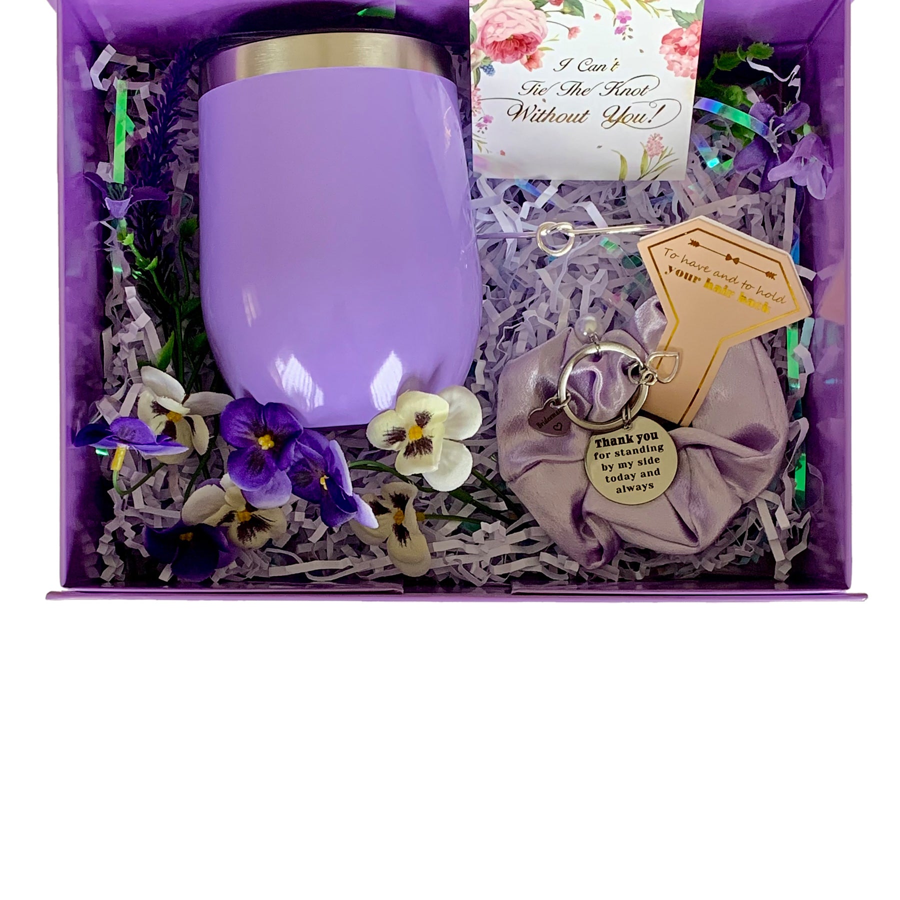 This Gift Box is the ideal token of appreciation for your Bridesmaids. It includes a Wine Tumbler (with a name or initial), a lavender Satin Headband, a Knot Bracelet, a beautiful key chain with a sentiment "Thank you for standing by my side today and always". These meaningful yet simple gifts will demonstrate your gratitude for your bridesmaids' hard work. Give them the perfect memento to commemorate your special day. Express your appreciation with a thoughtfully chosen selection. Your bridesmaids will cherish these pieces for years to come.