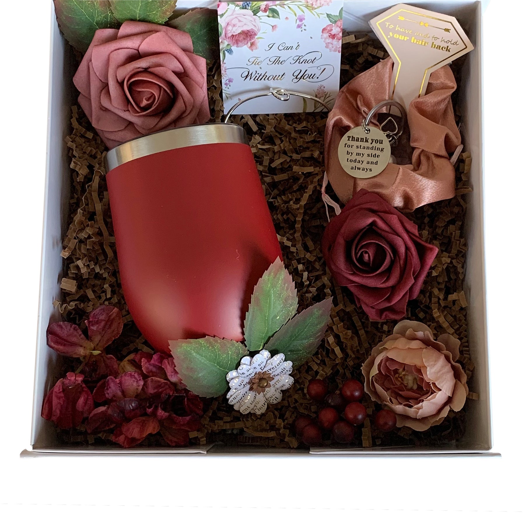 This Gift Box is the ideal token of appreciation for your Bridesmaids. It includes a Wine Tumbler (with a name or initial), a golden rose Satin Headband, a Knot Bracelet, a beautiful key chain with a sentiment "Thank you for standing by my side today and always". These meaningful yet simple gifts will demonstrate your gratitude for your bridesmaids' hard work. Give them the perfect memento to commemorate your special day. Express your appreciation with a thoughtfully chosen selection. Your bridesmaids will cherish these pieces for years to come.