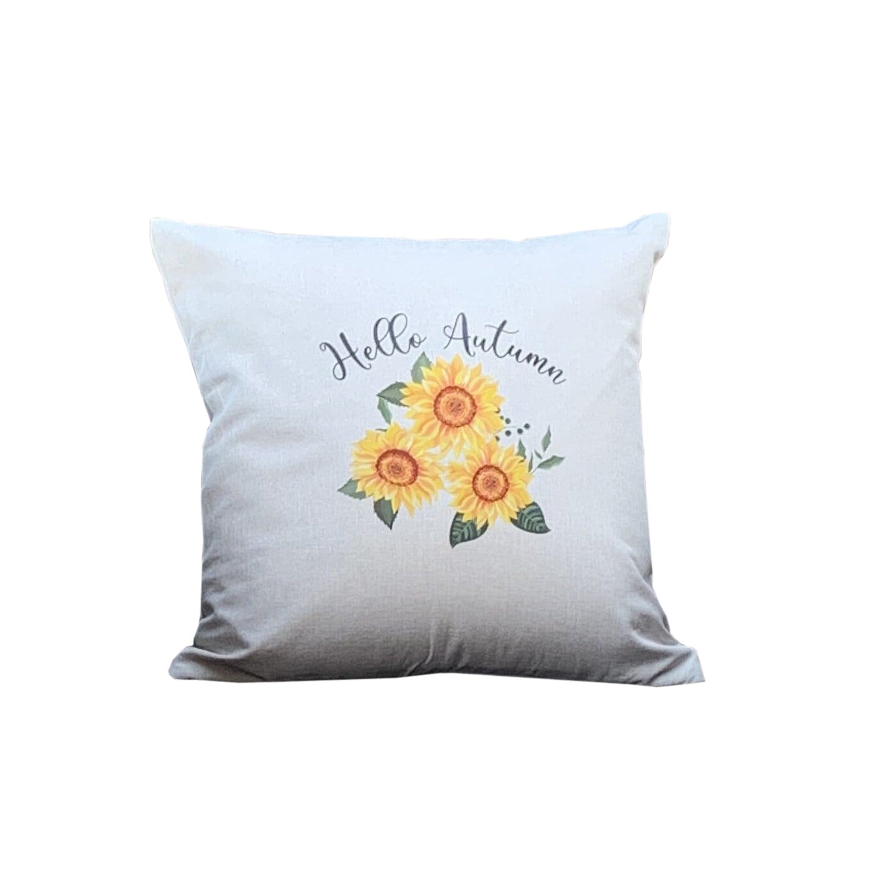 This 16" x 16" Pillow Cover, with the phrase "Hello Autumn" printed on it and decorated with yellow flowers, is an attractive gift or accent piece for this Fall or Thanksgiving season. The off-white color allows it to blend perfectly with your existing décor.
