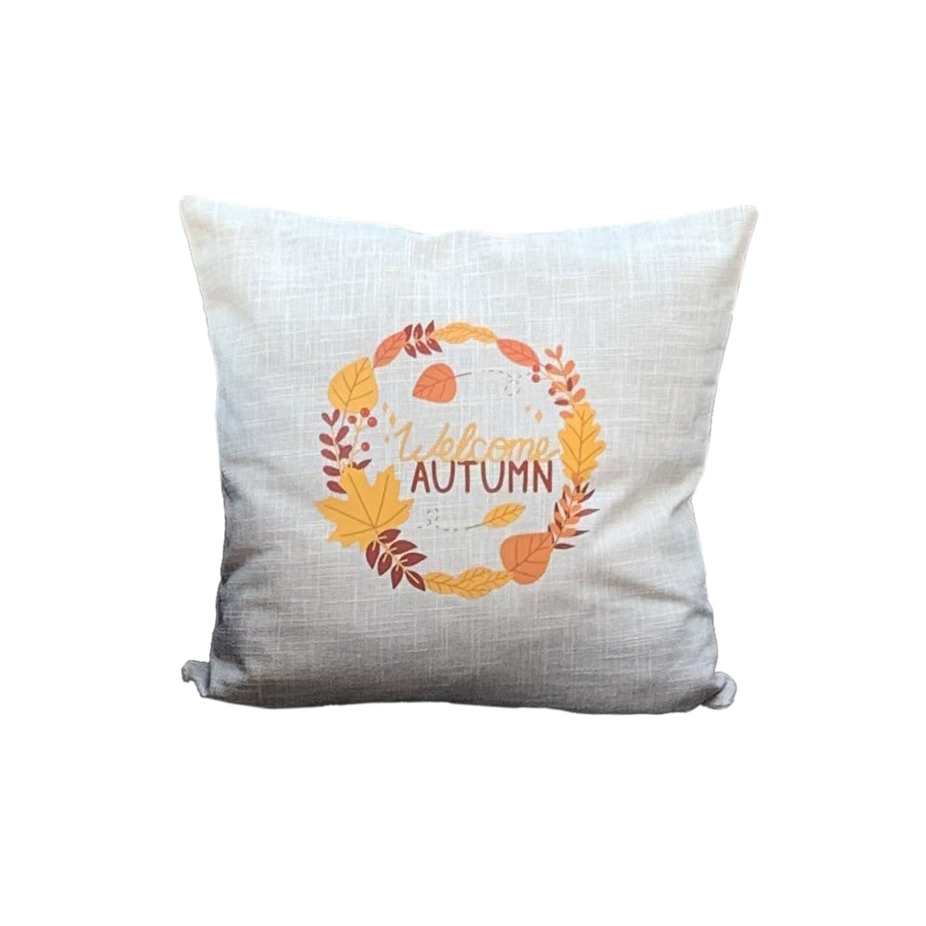 This 16" x 16" Pillow Cover, with the phrase "Welcome Autumn" printed on it, is an attractive gift or accent piece for this Fall or Thanksgiving season. The off-white color allows it to blend perfectly with your existing décor.