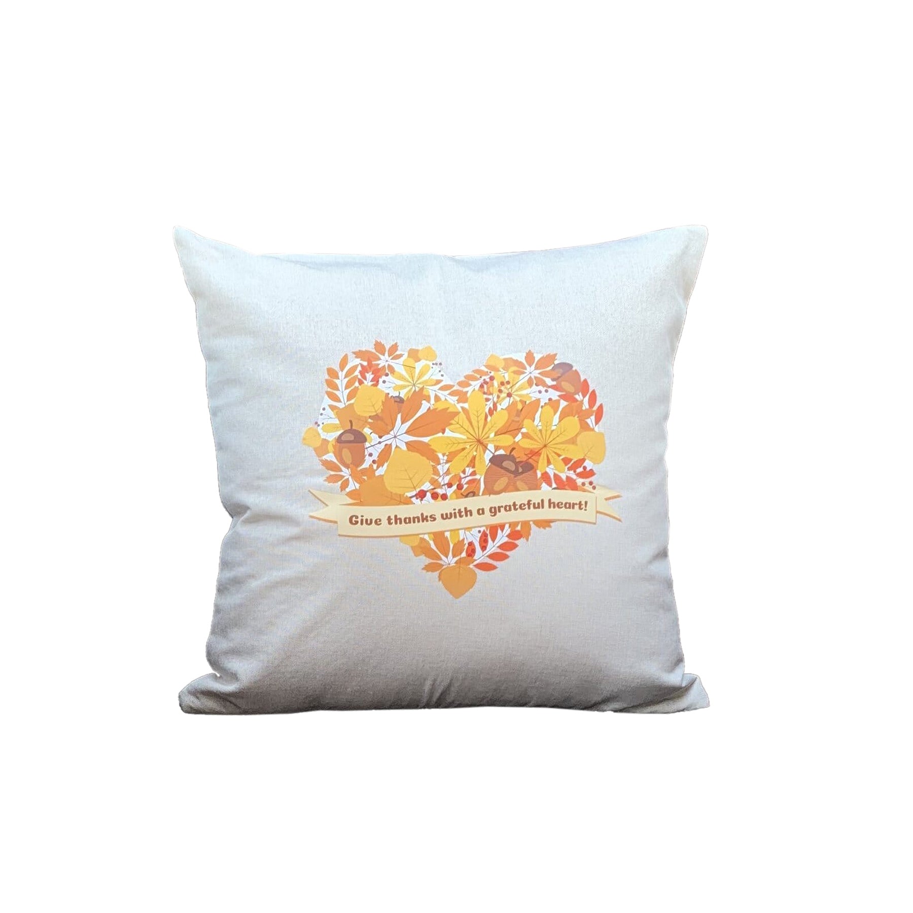 This 16" x 16" Pillow Cover, with the phrase "Give thanks with a grateful heart" printed on it, is an attractive gift or accent piece for this Fall or Thanksgiving season. The off-white color allows it to blend perfectly with your existing décor.