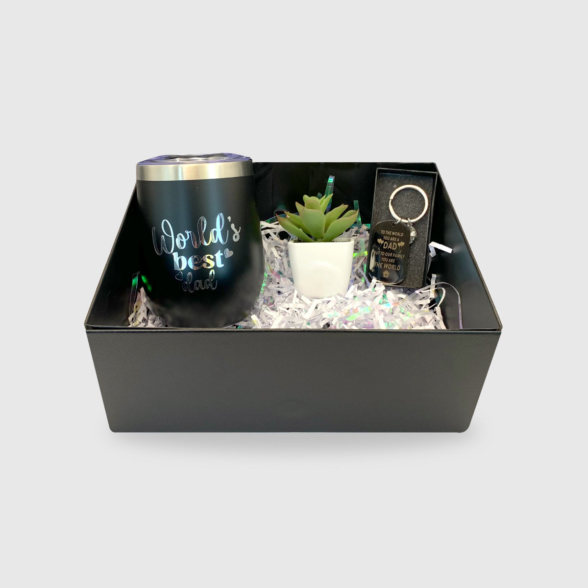 Treat Dad to the perfect Father's Day gift with this Father's Day Black Gift Box. This 9" x 9" x 3.4" magnetic closure box is carefully curated with a stainless black wine tumbler "World's Best Dad," an artificial succulent, and a keychain with the inspirational message "To the World you are a Dad, but to our Family You are the World." Make the day extra special with this thoughtful gift!