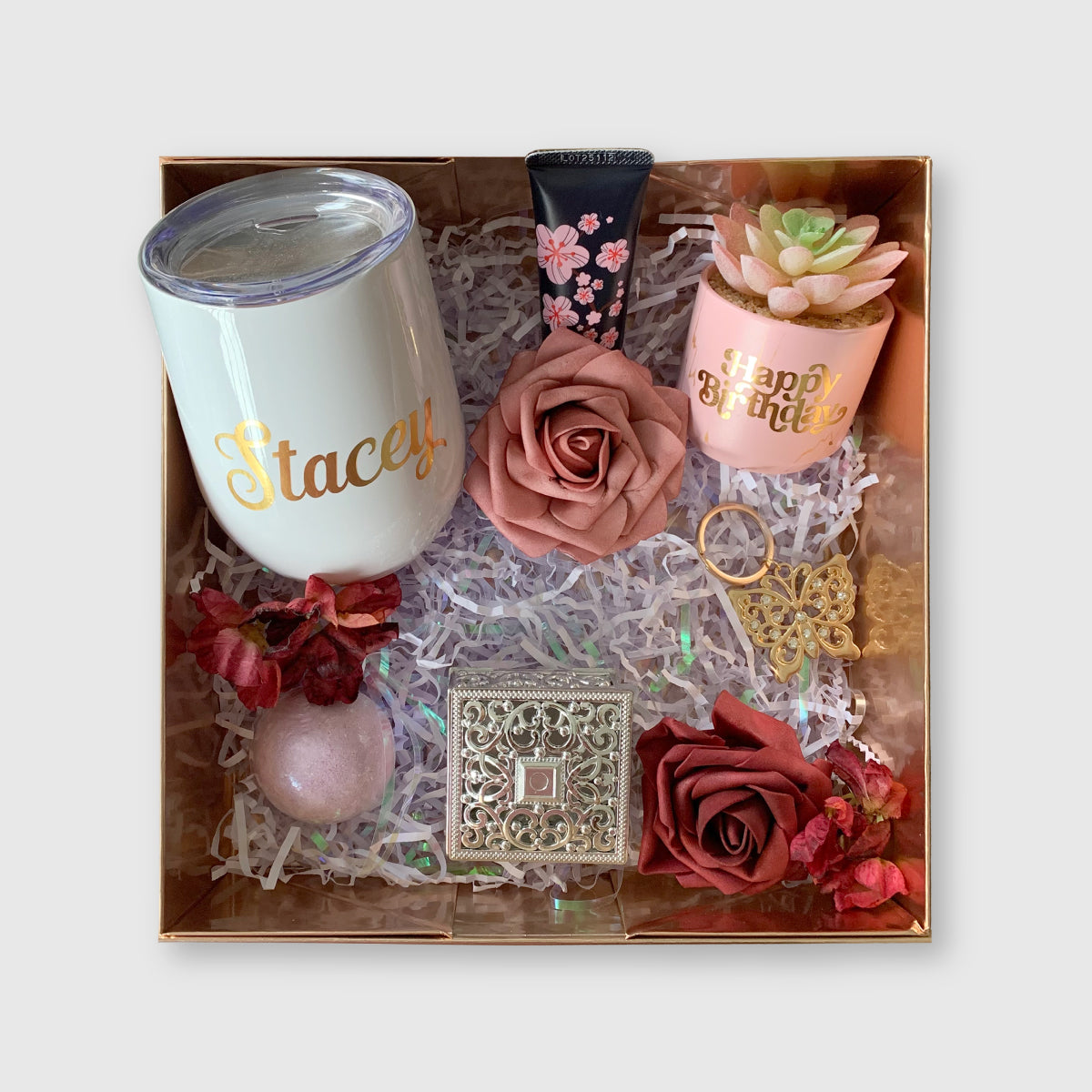 This Golden Rose Gift Box is an ideal option for birthday, graduation, Mother's Day, or Christmas celebrations. With dimensions of 9"x9"x3.4", it contains a personalized wine tumbler, a pink artificial succulent with a "Happy Birthday" message, a butterfly key chain (1.7"x1.7"), a travel-size hand lotion, a plastic silver jewelry box (2.3"L x 2.3"W x 1.2"H), and a bath bomb.