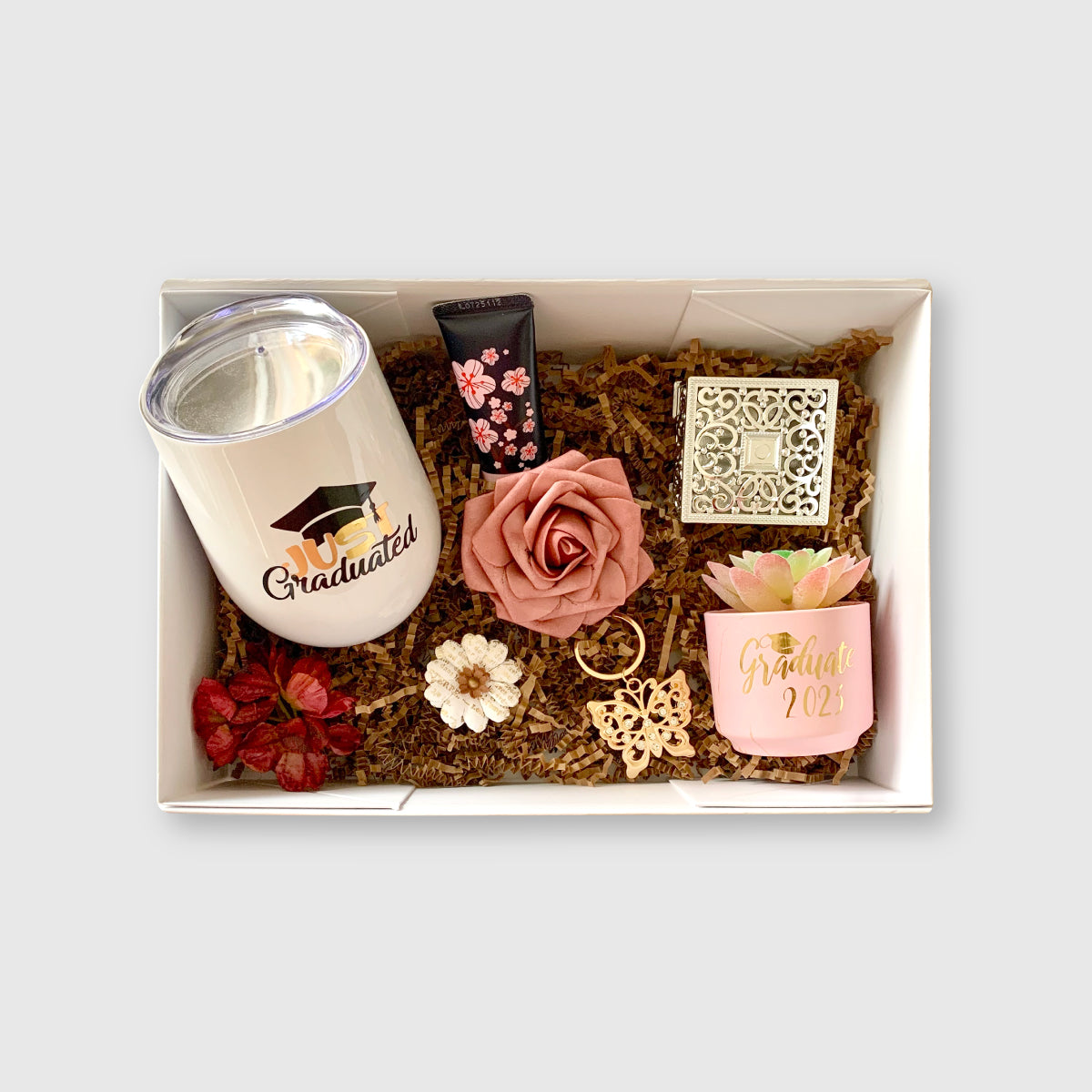 This White Gift Box is an ideal choice for a graduation celebration. Its dimensions of 11" x 7.5" x 3.5" provide the perfect space for a Wine Tumbler with "Just Graduated" messaging, a 1.7" x 1.7" Butterfly Key Chain, a travel-sized Hand Lotion, a mini artificial succulent with the wording "Graduated 2023," and a small piece of plastic jewelry box.
